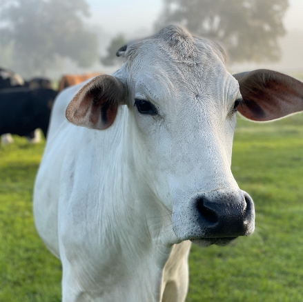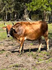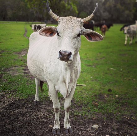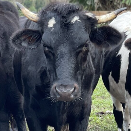 Ozzy is very smart, clearly good at figuring out how to get out of pastures, and very sweet. He loves people, loves the babies of the herd (he is one of the only males the moms will allow to babysit the kids), and absolutely adores eating palm trees. Indeed, he has destroyed many a fence trying to reach an inaccessible palm tree. You can always find Ozzy front and center for treats during moo-kets.