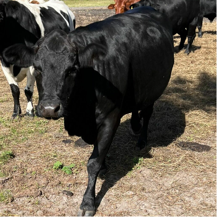 Claire is the herd leader (matriarch) and can often be seen lurking in the back of the herd, watching over everyone, making sure no funny business is about. She isn’t a fan of being pet, but she might come up for cow cookies. She is more than likely a Brangus cow, but more Brangman than Angus.