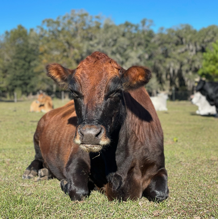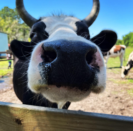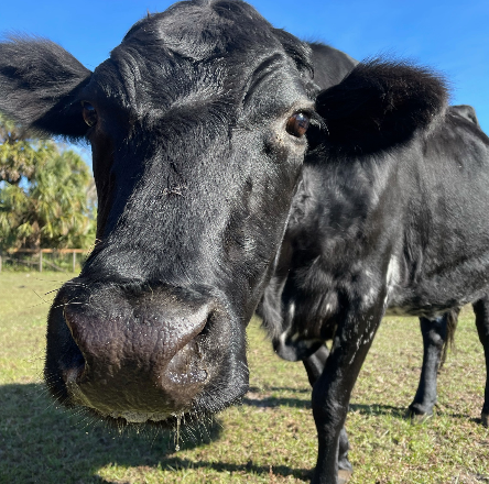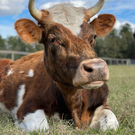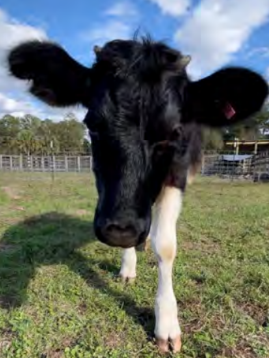 George Harrison Valentino is a Holstein mix who was meant to be a veal calf, but he was so cute and sweet that a UF student (thankfully) rescued him. He was hand-raised by kind people, but he eventually got really lonely and started to break out of his pasture looking for other cows. That led his family to find CCFS, where he could become part of a herd. He’s obviously a giant puppy, just watch out for his horns!