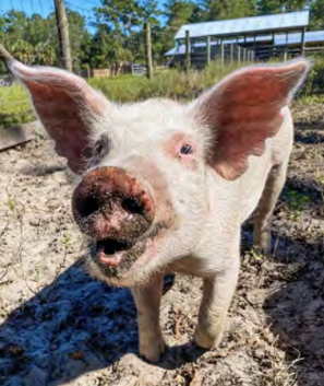 Albert, Oliver, Rupert, and Hog Solo came from the NC42Save operation. They were “cull” piglets — meant to be pulled from their factory farm home at 3 months of age and sent to the gas chamber and thrown in the trash. The reason? They were too small or sick to bother to continue feeding, so it was more profitable to simply kill them. They have no tails because the factory farms remove their tails with no anesthesia. Pigs in factory farms are stuffed in entirely dark, cramped, unsanitary conditions, and they sort of go crazy because of it and bite at each other’s tails. Rather than make conditions better, farmers simply cut their tails off.