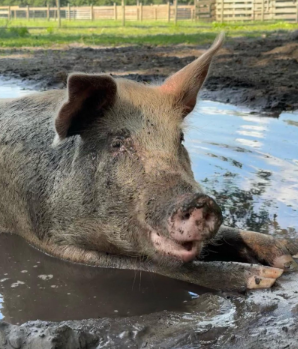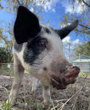 At just 1.5 weeks of age, Marley was taken from her mother and loaded onto a truck to be taken to a “nursery”. Had she survived the nursery, she would have been moved to a finishing farm. At 3 months, if she were too small or too sick, she would have been sent to the gas chamber. Otherwise, she would have been allowed to live for six months, then loaded onto a truck and sent to the slaughterhouse. Marley either jumped or fell from the truck on its way to the “nursery” and luckily survived the fall, managing only to get a few scrapes, bumps, and bruises. She loves attention, food, and rolling in the mud with her new piggy friends at CCFS.