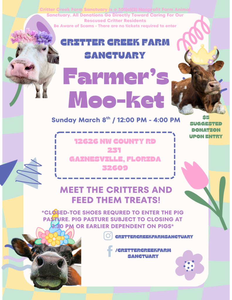 If you would like to meet our residents, we host a monthly plant-based farmers moo-ket at the Critter Creek facility, during which you can browse our vendors and meet the critters. All products sold at the event are 100% plant-based. There are interactive tours of the pig pasture, and you also have the opportunity to feed the cows treats over the fence.